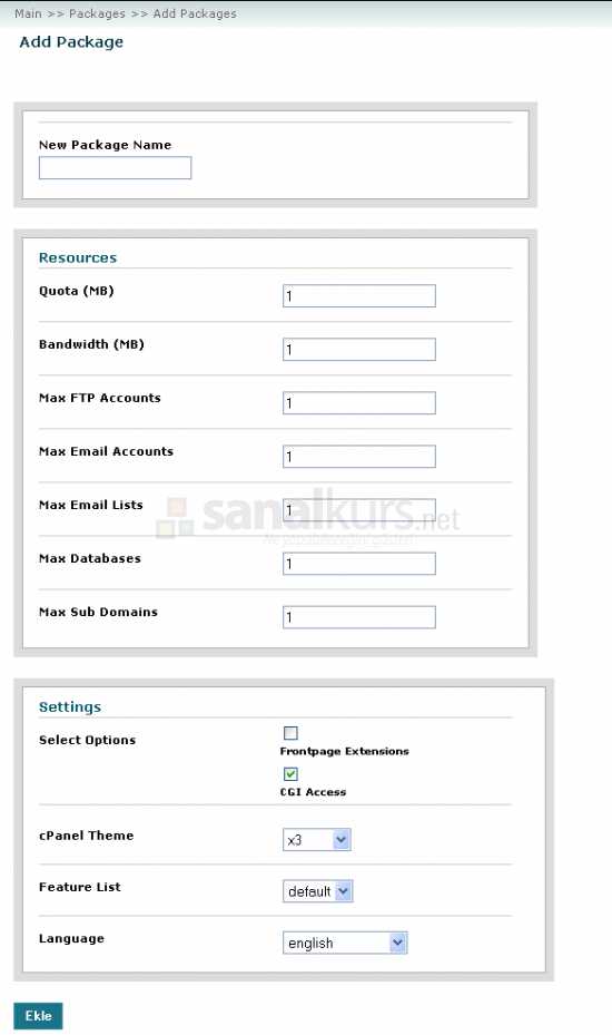 Resimde görülenleri kendinize göre düzenlemeniz gerekiyor.Yani kendi bilgilerinizi gireceksiniz.En üstteki New Package name yazan yere paket adını yazacaksınız.Tüm bilgilerinizi girdikten sonra Ekle butonuna tıklayıp paketinizi hazır duruma getirebilirsiniz.