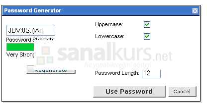 Regenerate butonu yeniden şifre oluşturmaya yarar.Sağdaki seçenekler şifre içeriğini gösterir.Bunları kısabilirsiniz.En son "Use Password" butonuna basın.Seçilen şifre password bölümüne yansıyacaktır.
