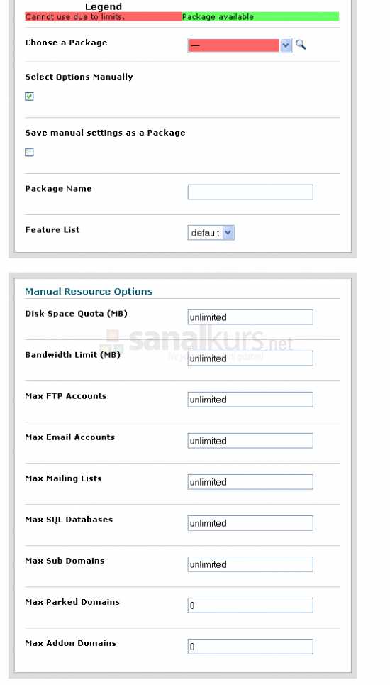 Disk Space Quota (MB) : Bu alana host alanının değerini MB cinsinden vermelisiniz.Eğer hesabınız limitsiz paket açmayı destekliyorsa unlimited yazısı ile limitsiz hesap açabilirsiniz.