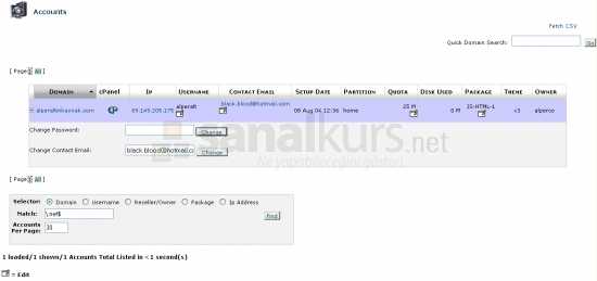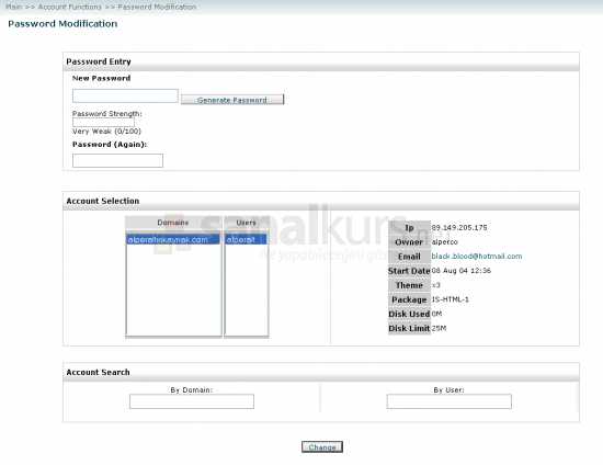 Açmış olduğunuz hesapları listelemeye yarar.Bilgi almaya ve bir kaç özellikte değişiklik yapmaya yarar.Sırayla açıklayayım.Domain yazan yerdeki + butonuna basarsanız Şifre ve Email düzenleme bölümü açılır.Resimde görüldüğü gibi.Yeni değerleri girdikten sonra hemen yandaki change butonuna basarak geçerlilik kazandırabilirsiniz.